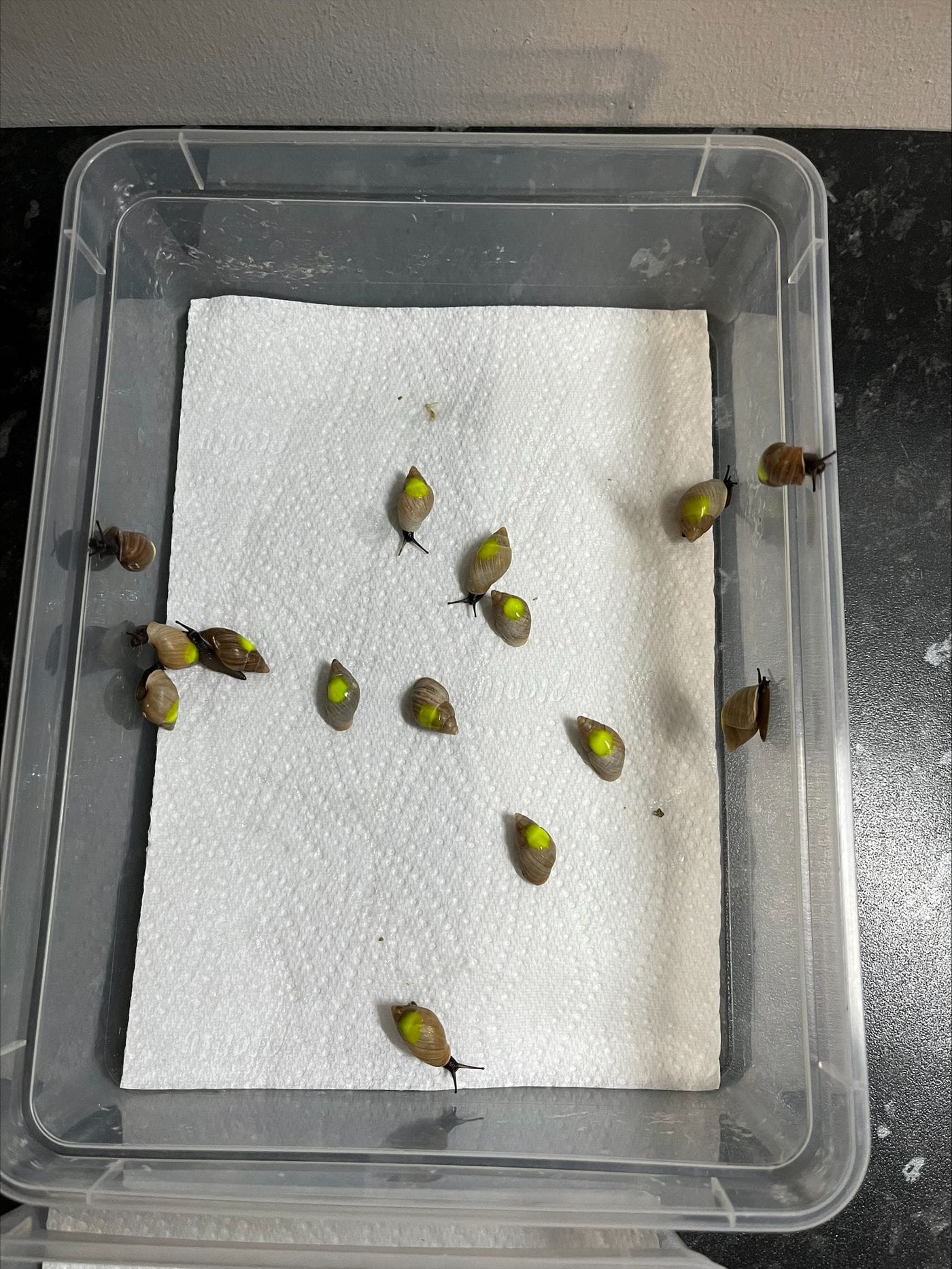 Monitoring is extremely important when it comes to tracking the success of conservation and reintroduction programmes, so our team have painted each snail with UV paint as a tracking device to monitor their movements and survival. Each year we pick a different colour, last year we chose blue and this year it’s yellow. The team painted their shells in different locations depending on their life stage, on the first whorl for adults and the apex of the spire of the shell, the tip, for adolescents. This technique enables us to track their survival across many years when surveying out in the field where they were released, as well as monitor if, and how many, juveniles reach adulthood. This year we are also trialling a new topcoat to increase the length of time the paint remains on the shell.